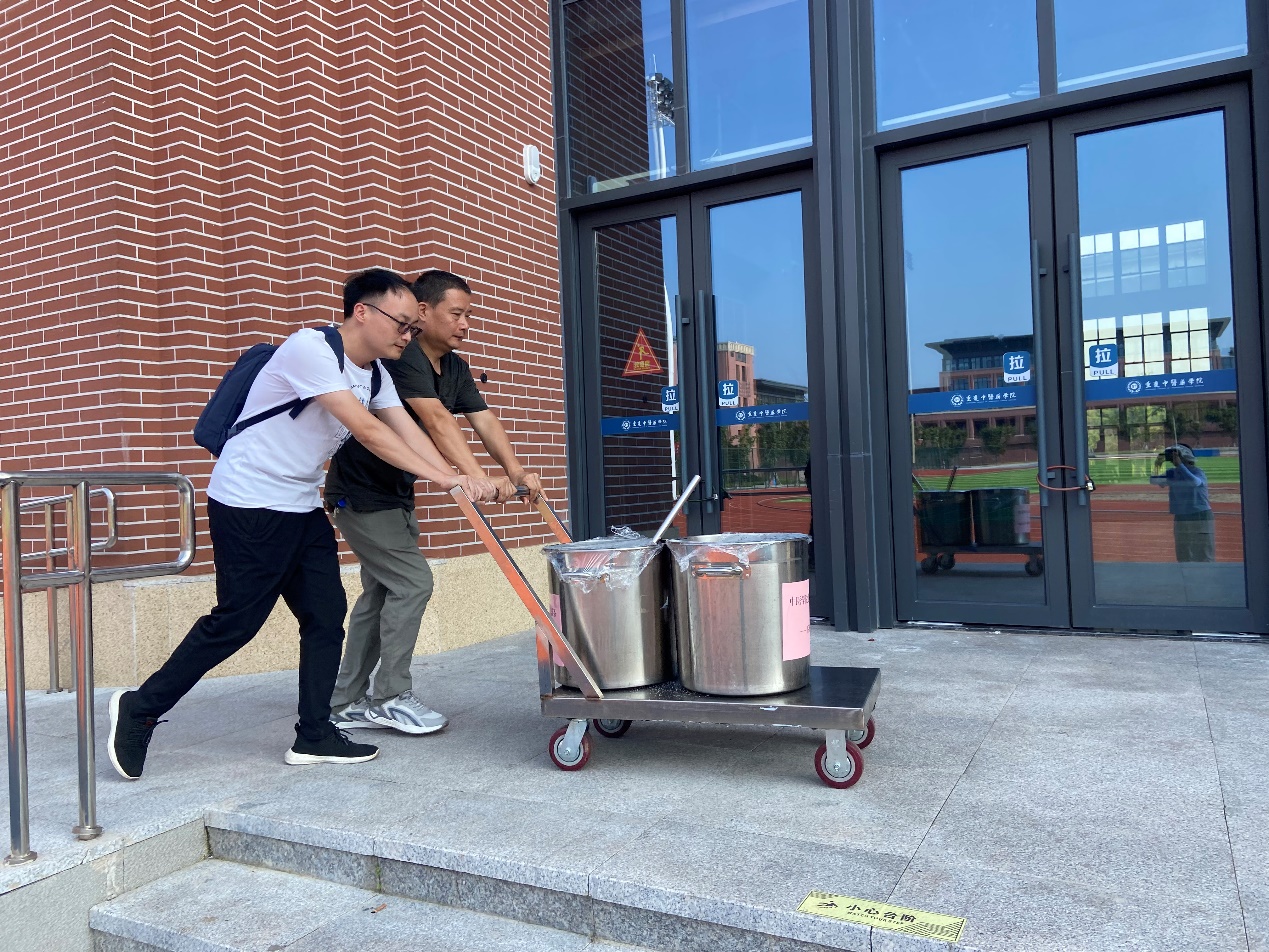 中医学院老师与后勤保卫处老师一起为军训学子送清凉茶
