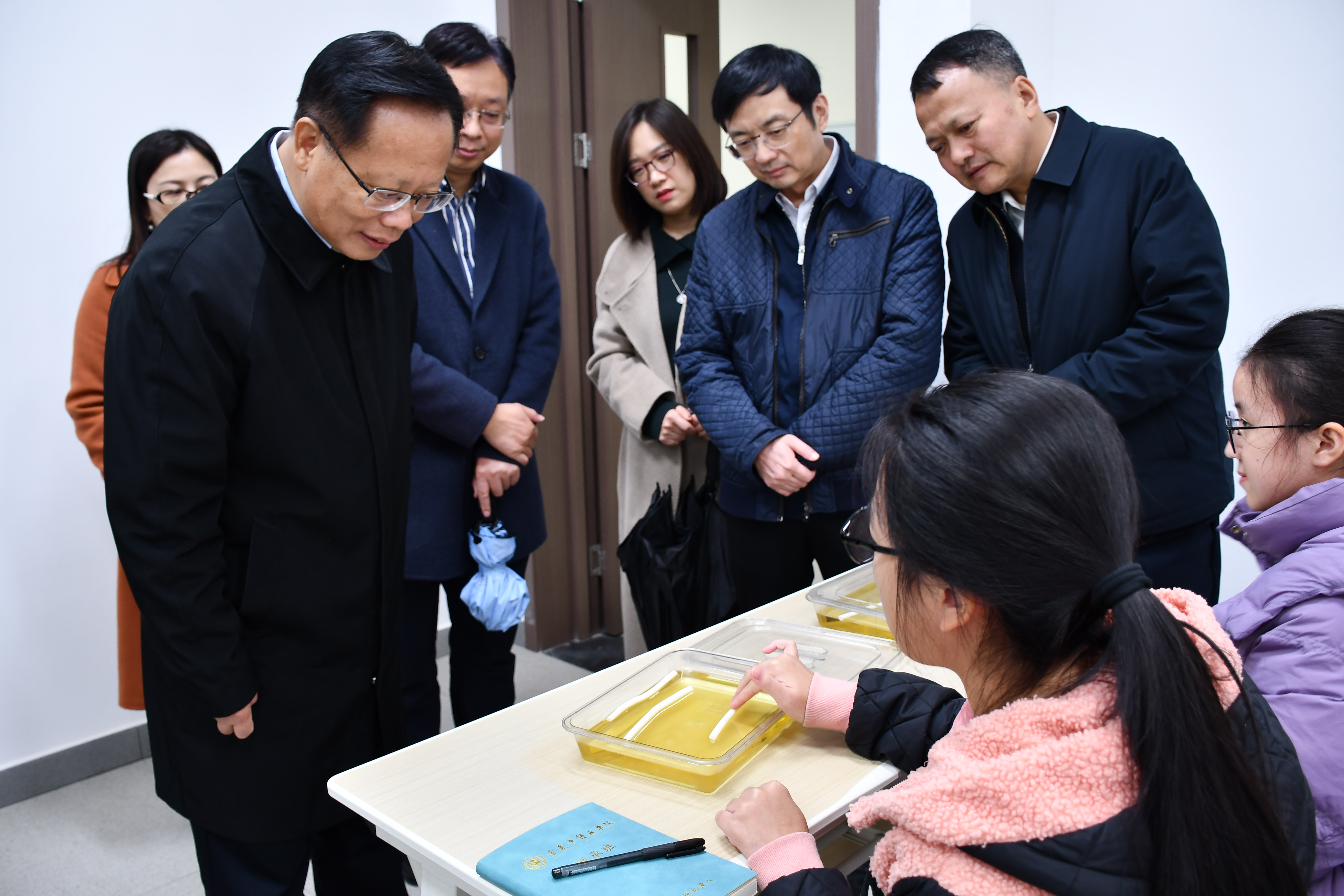 秦怀金一行参观调研了bat365古中医研究院、基础医学院、中医学院,在留小忠教授师承实验班教学课堂上,他与学生们亲切交流,详细询问学生们的课程安排和校园生活等情况,并嘱咐同学们:学习、身体都要抓牢,要保证体育运动的时间;学中医大有可为,希望同学们坚持对中医学习的热爱,做好中医药传承接班人。