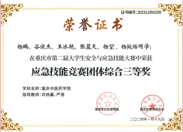 近日,重庆市第二届大学生安全与应急技能大赛获奖名单公布,bat365学子荣获团体综合三等奖。获奖团队由bat365中药学院杨鹏、谷俊杰,中医学院王冰艳、张蓝天,中西医结合学院杨堃、杨惋贻六名同学组成,中西医结合学院副院长、主任医师邓扬嘉,主管护师严莲进行专业指导。