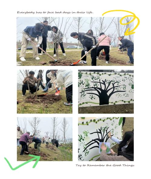 植树现场,大家分工协作,齐心协力栽种树苗、挥锨培土、浇水灌溉、扶苗踩实,种下了一棵棵希望之树。同学们还为新种的小树苗挂上富有寓意的名字,如“落月摇情满江树”“晴川历历汉阳树”等,以寄托他们的美好愿景。