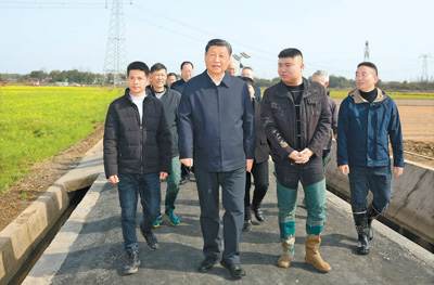 3月18日至21日,中共中央总书记、国家主席、中央军委主席习近平在湖南考察。这是19日下午,习近平在常德市鼎城区谢家铺镇港中坪村,同种粮大户、农技人员、基层干部亲切交流。新华社记者 鞠 鹏摄