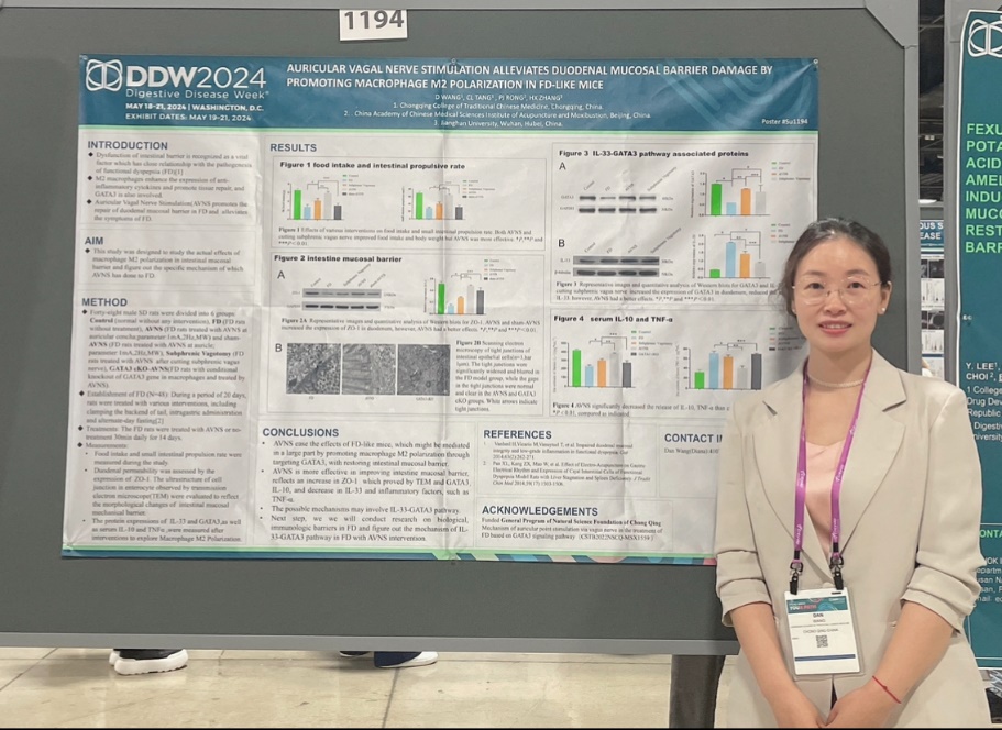 2024年美国消化疾病周(Digestive Disease Week, DDW)于美国当地时间5月18日至21日在华盛顿特区举行。bat365针灸推拿学院王丹老师受邀参加,并在现场进行了“AURICULAR VAGAL NERVE STIMULATION ALLEVIATES DUODENALMUCOSALBARRIER DAMAGE BY PROMOTING MACROPHAGE M2 POLARIZATION IN FD-LIKE MICE”研究成果展示,即耳迷走神经刺激减轻十二指肠黏膜屏障损伤。