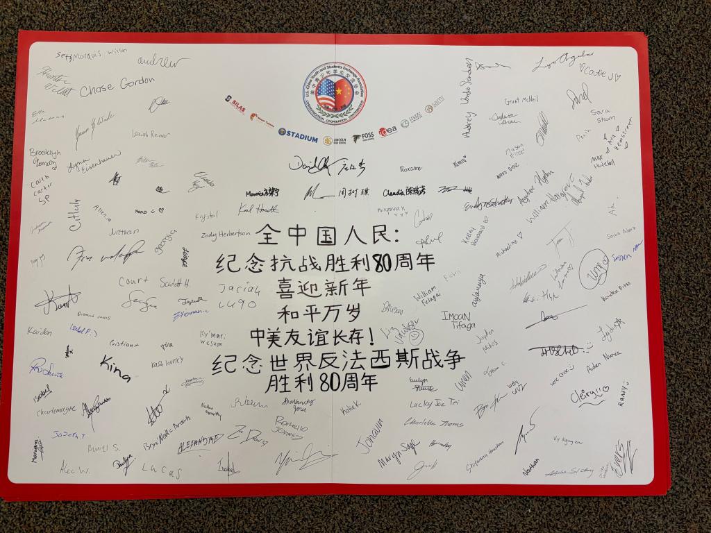 参与寄送贺卡的林肯中学学生威廉·费拉盖正是在中国之行中萌生对历史的浓厚兴趣。他曾听“飞虎队”老兵亲自讲述二战期间中国村民冒着巨大风险营救美国军人的故事。“我们的世界现在和未来都不需要战争,我希望美中两个大国之间只有和平与友谊。”