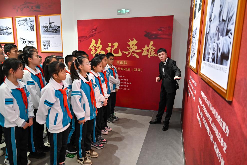 2024年11月30日,乌鲁木齐八一中学的学生在观看“铭记英雄——飞虎队主题历史图片展巡展(新疆)”。新华社记者 丁磊 摄