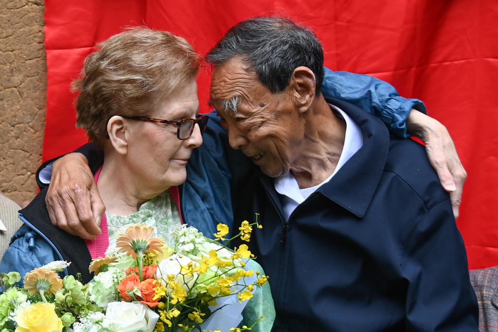 2024年4月17日,在浙江衢州江山市张村乡龙头店村,“杜立特行动”3号机领航员查尔斯·奥祖克的女儿苏珊·奥祖克(左)与村民廖明发相拥。1942年,村民廖诗原(廖明发的父亲)一家曾悉心照顾跳伞降落的查尔斯·奥祖克。新华社记者 黄宗治 摄