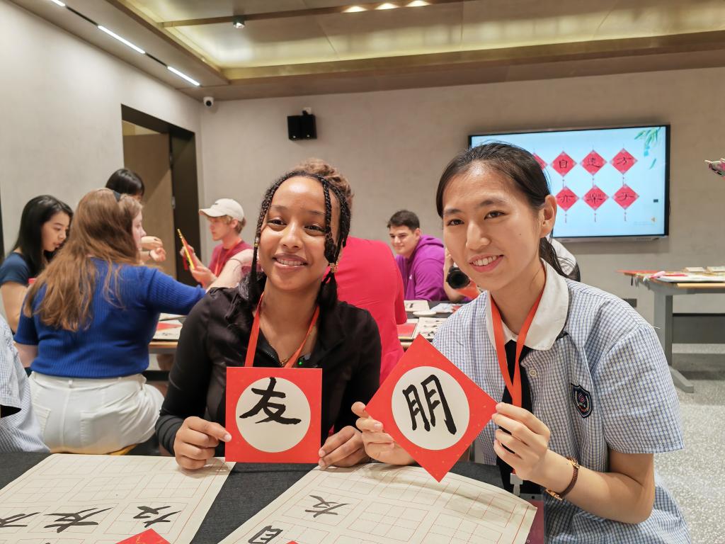 2024年6月8日,在河北省石家庄外国语学校,美国山谷高中学生娜斯拉(左一)在上汉字书法课。新华社记者 杜一方 摄