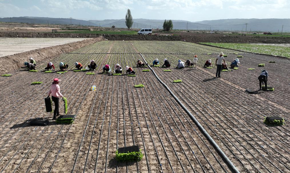 甘肃省定西市安定区内官营镇菜农在铺设了滴灌管道的地里移植西芹(资料图片)。(杨晓军 摄)