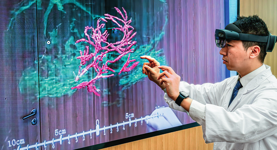 科研人员通过混合现实技术,微米级呈现脑机接口装置与大鼠大脑主要血管和脑组织的空间位置关系(2025年3月26日摄)。肖艺九摄/本刊