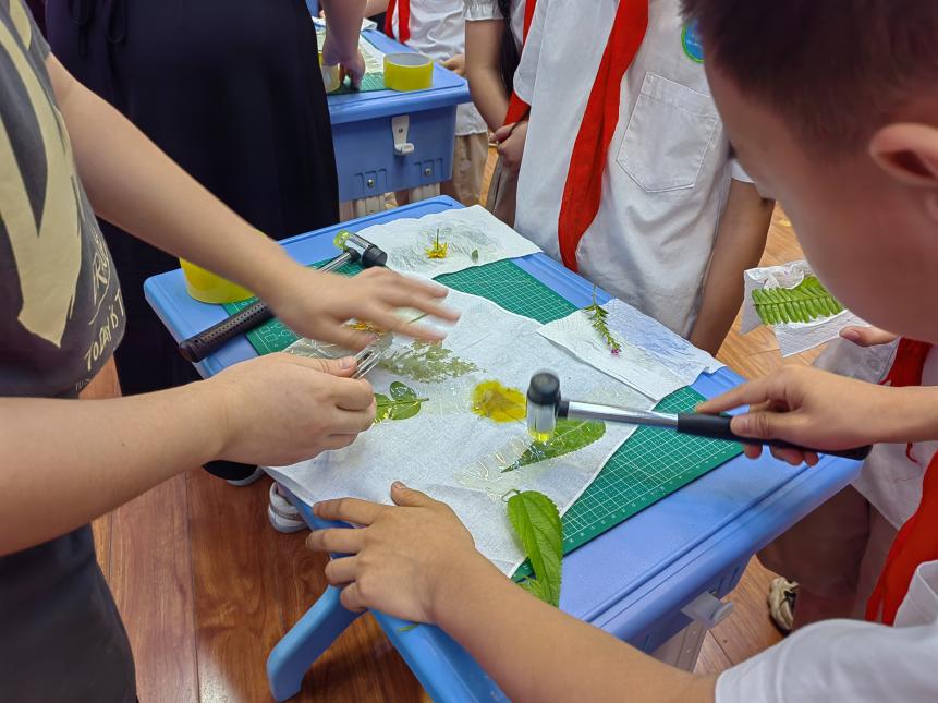 在中药标本拓印环节,社团成员展示了药草标本并介绍拓印技艺历史,本次活动指导老师敬勇则讲解了植物形态与药用功效。小学生们亲手操作,将薄荷、艾叶等植物的纹理拓印于方巾之上,体验传统技艺。