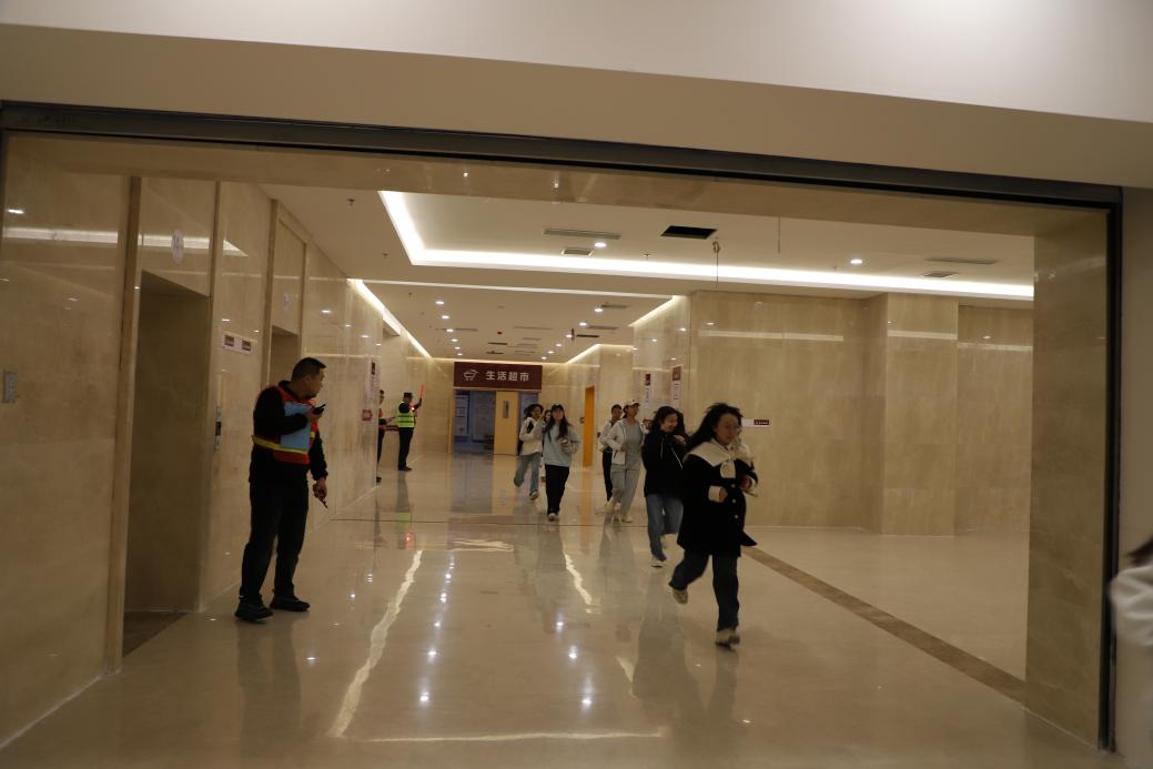 演练模拟西区宿舍5楼因洗衣机短路引发“火情”。下午16时整,火灾警报骤然响起,消防广播发布紧急疏散指令,宿舍管理员立即上报火情,疏散引导小组的辅导员与学生志愿者迅速就位,组织学生按照预定疏散路线快速、有序撤离。安全保障、医疗救护等小组协同配合,警戒、救护、灭火等环节衔接紧密。最终,全体参演师生在4分30秒内全部安全撤离至指定集结区。