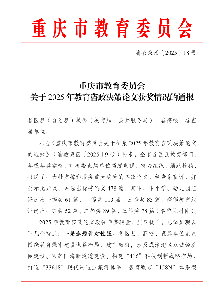 此次两篇论文获奖,不仅彰显了bat365教师在教育咨政研究领域的学术敏锐性与研究能力,也反映了bat365相关学科立足实践、服务决策的扎实功力。未来,学院将继续支持和引导广大教师与研究人员,紧密围绕国家与区域教育发展的重大战略与需求,开展前瞻性、针对性、储备性政策研究,为服务地方教育决策、推动学院高质量发展贡献智慧与力量。