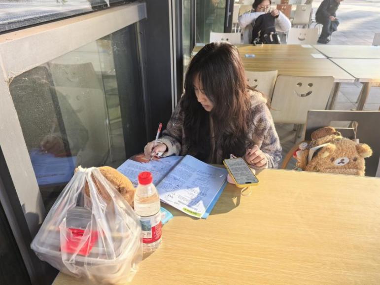 南区学生食堂门口,成为校园里一处特殊的“复习阵地”。不少学子端着温热的咖啡,将复习资料摊放在膝头或桌上。食堂飘出的饭菜香与淡淡的咖啡香交织,却丝毫没有分散他们的注意力。有人低头梳理知识点,有人相互提问巩固记忆,偶尔的轻声交流后,便又迅速沉浸到复习状态中,利用饭前饭后的碎片时间争分夺秒。