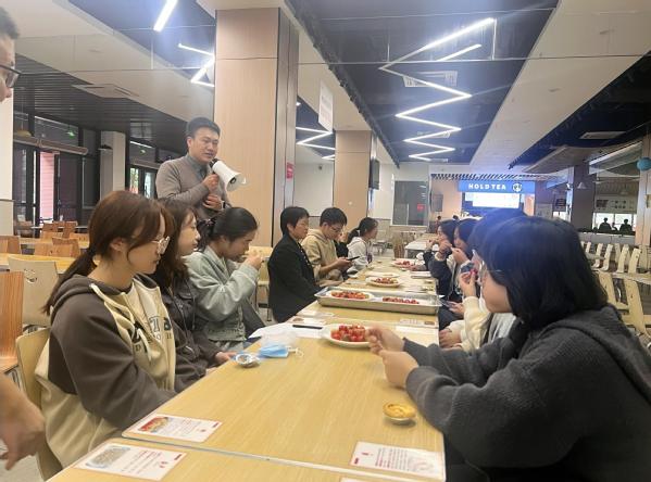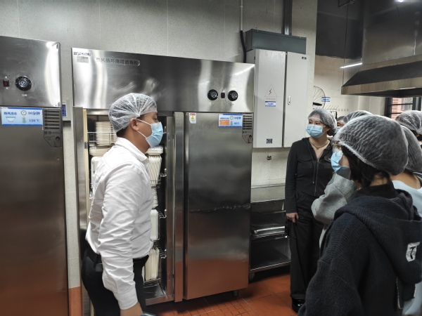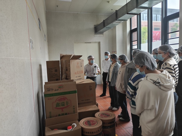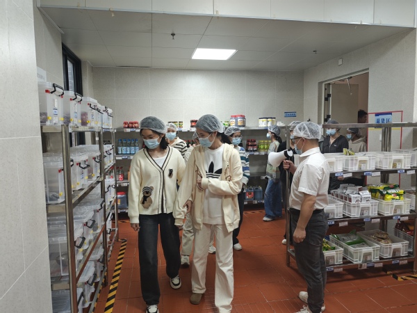 在食堂一楼,学生食堂餐饮公司负责人向参加活动的师生代表就学生食堂档口情况、食堂原料采购、食品贮存、生产加工、食品留样、清洗消毒、餐厨废弃物处置、员工管理等情况作了简要介绍。随后,师生代表在餐饮公司负责人的带领下先后参观了食堂食品原材料库房、原材料验收区、加工清洗区、切配间、烹饪间、售餐间、原材料检测室等多个工作区域,边看边询问了解情况,直观地了解了学院食堂的管理和运营过程。