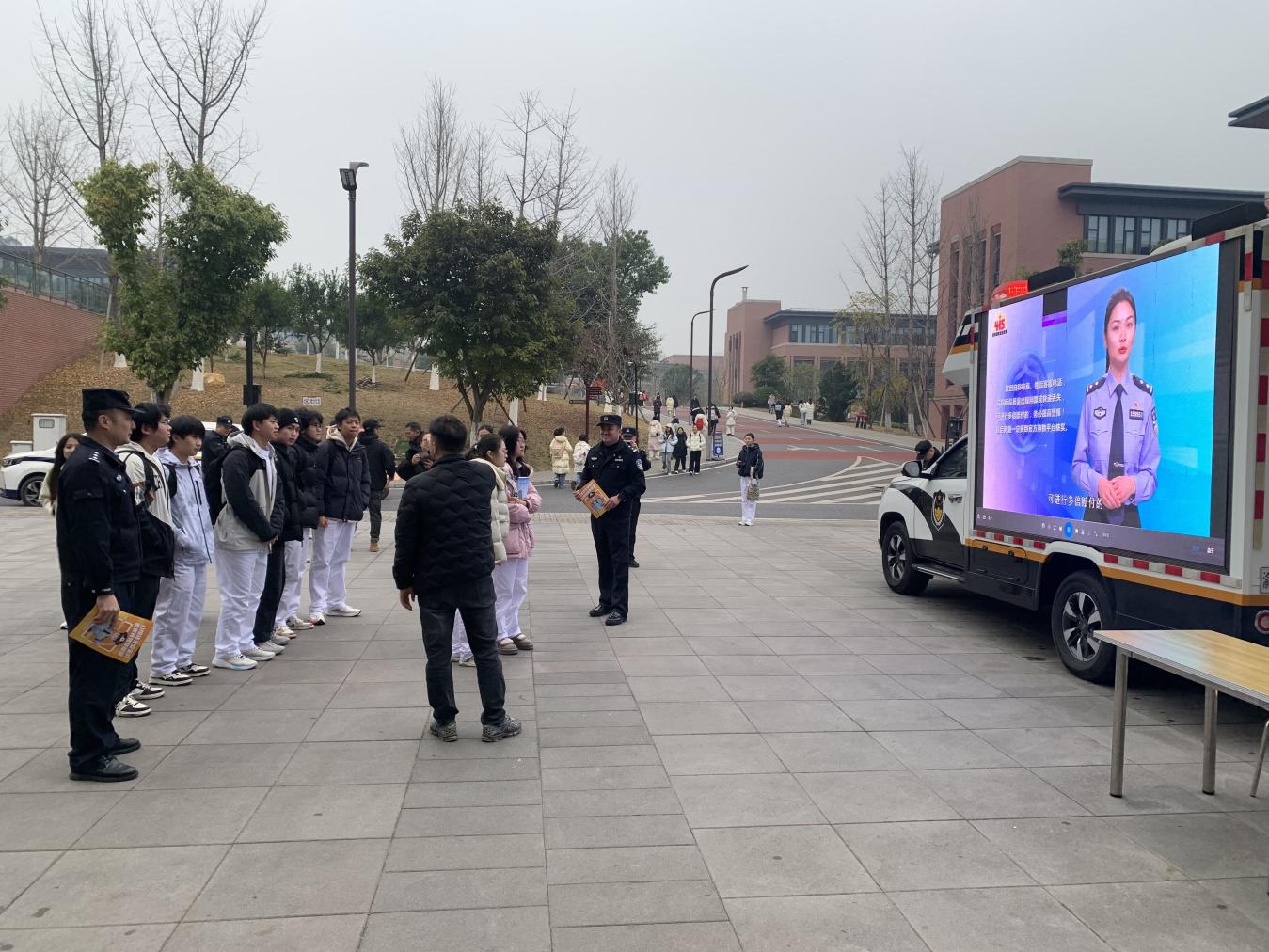 活动现场,民警与后勤保卫处工作人员向过往师生发放反诈宣传资料,并通过宣传车电子屏循环播放典型诈骗案例纪录片及反诈公益宣传视频,多形式、多途径普及反诈知识。