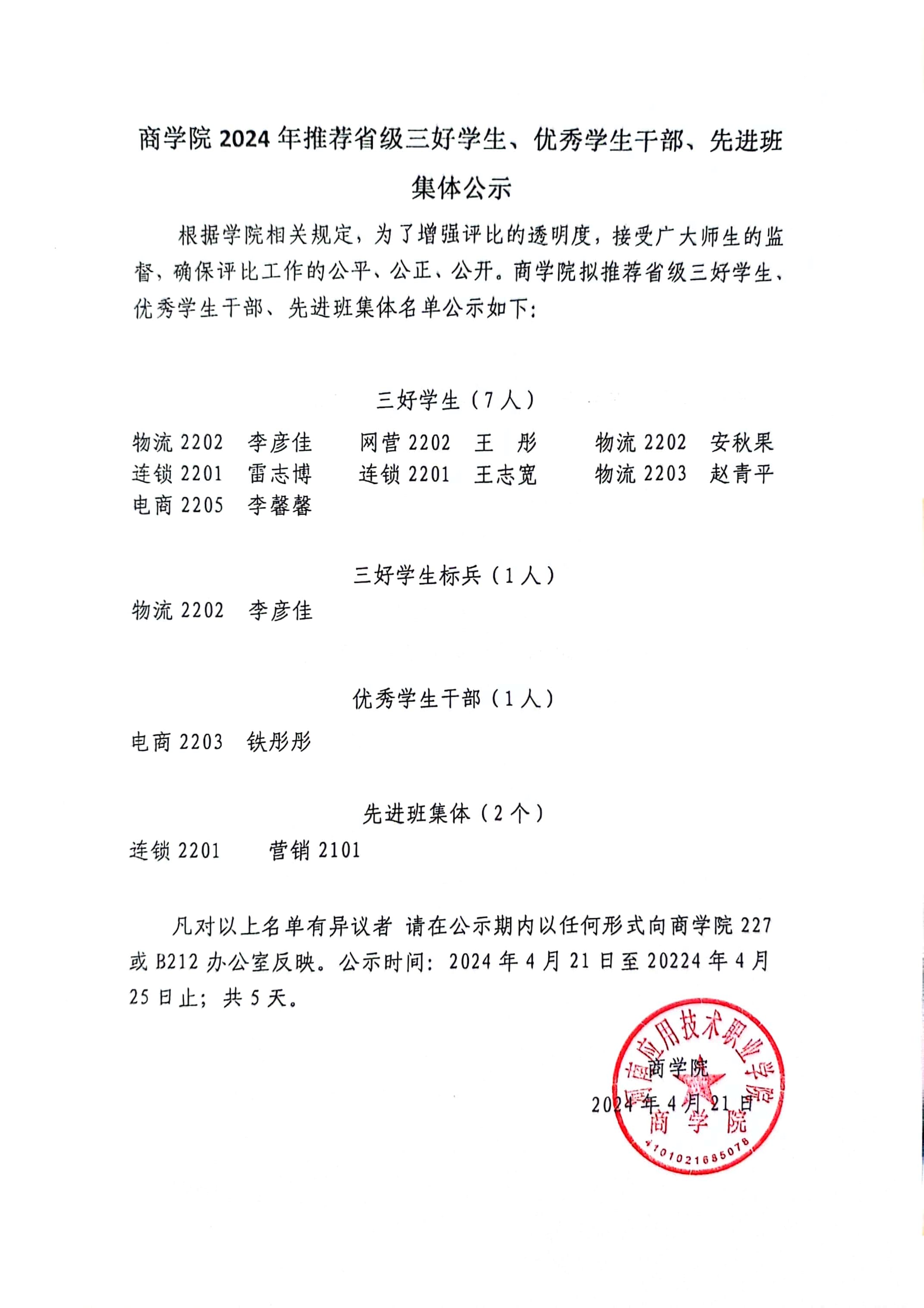 beat365英国官方网站2024年推荐省级三好学生、优秀学生干部、先进班集体公示