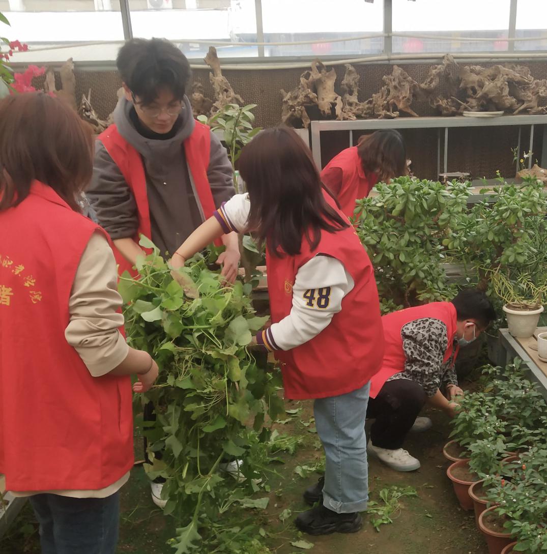 3月12日下午,五一公园内绿植花房里,到处都是身着红色马甲志愿者,他们弯腰弓背,清理花房里的垃圾,在工作人员的指导下为绿植松土、浇水、施肥、修整,补种花草,清理枯叶等等。很多同学是第一次干这种农活,有些还需要花房里工作人员示范演示,但他们虚心接受指导,不挑活,不怕脏,不怕累。尽管手指上沾满了泥巴,脸上却漏出会心的笑容。志愿服务持续了两个多小时,同学们带走了花房里的“不速之客”,留下了绿色、整齐与美丽,留下了志愿服务的爱心与奉献。