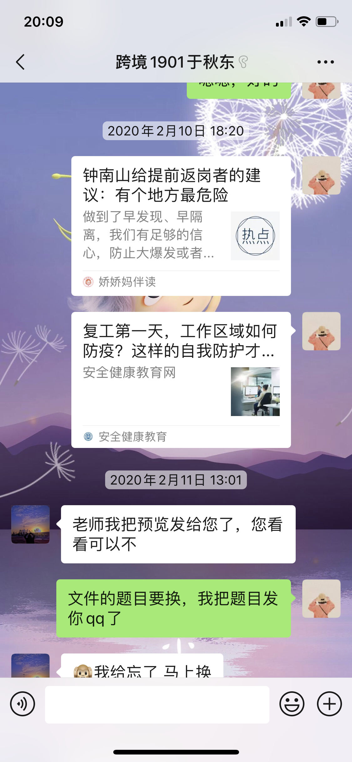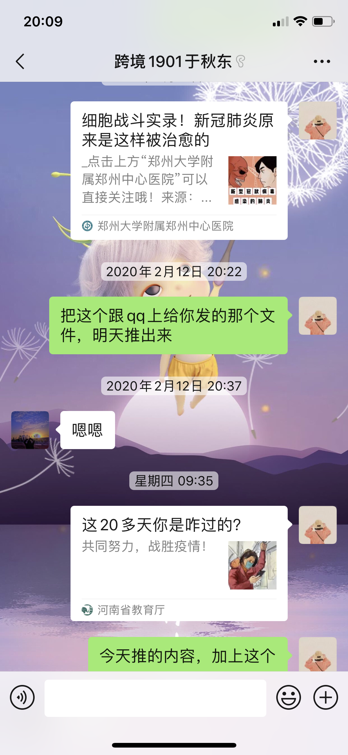 她是总支的宣传委员,经历了最初获悉疫情蔓延势态的恐慌、不知所措到淡定的接受。她知道这时候负责宣传工作的她要勇于发声,引导大家对疫情有一个正确的认识。从大年三十晚上开始,每天浏览各大网站,收集官方媒体发布的防护措施和疫情动态,撰写新闻稿,编辑后通过公众号对全体师生推送,引导师生科学防控,不信谣,不传谣。截止手稿之日,已累计发送信息40余条。