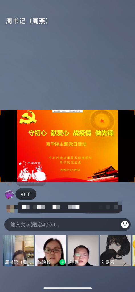 2月28日晚上,beat365英国官方网站全体党员同志以网络视频的形式召开了一次特殊的主题党日活动。此次党日活动是积极响应习近平总书记关于新型冠状病毒感染肺炎疫情防控系列重要指示批示精神,充分发挥好疫情防控期间基层党组织战斗堡垒作用和党员先锋模范作用,根据学校《关于组织开展“守初心、献爱心、战疫情、做先锋” 线上主题党日活动的通知》召开的。学校党委委员陈君丽同志作为支部成员全程参与主题党日活动。周燕副书记主持活动。