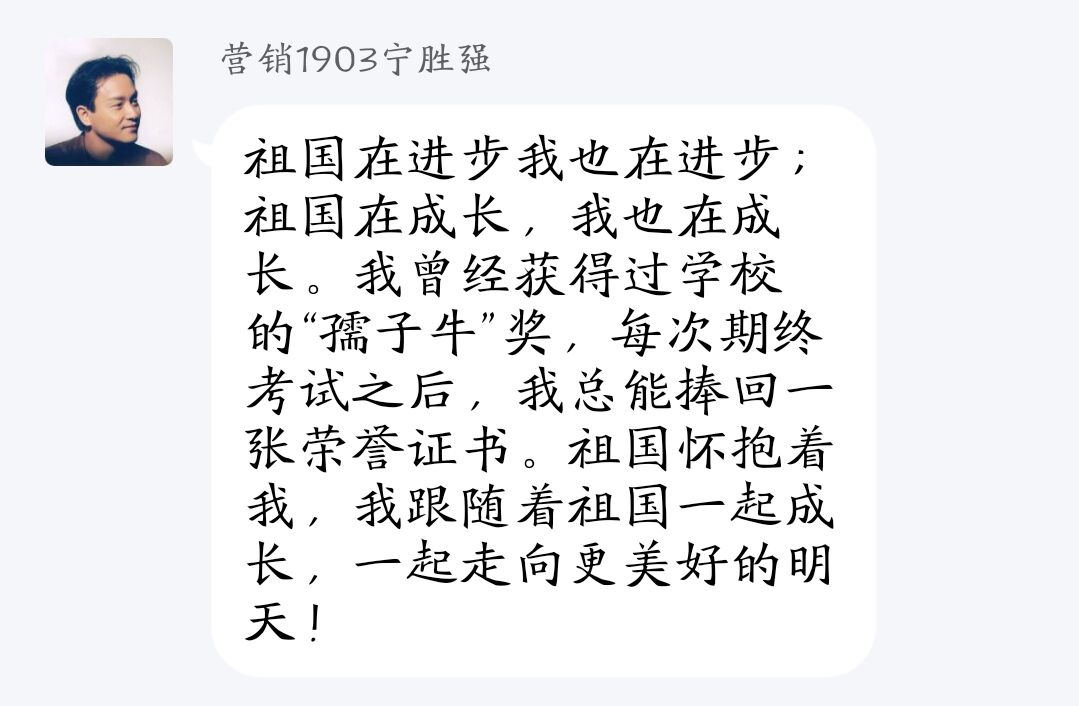 营销1902:刘啸天:今天是五四青年节,晚上看完“出彩河南人”之第三届最美大学生五四特别节目,心潮澎湃。今年是五四运动第一百零一年,过去的一百年中,老一辈革命家脚踏实地埋头苦干,才铸就了现在的辉煌。我们作为新一代的青年要将五四精神传承下去,不负党和国家的期望,勇担重任,在人民需要的地方发光发热。鲁迅先生有言:“愿中国青年都摆脱冷气,只是向上走,不必听自暴自弃者流的话,能做事的做事,能发声的发声,有一分热,发一分光;就令萤火一般,也可以在黑暗里发一点光,不必等候炬火。”让青春为祖国绽放,五四精神,传承有我!