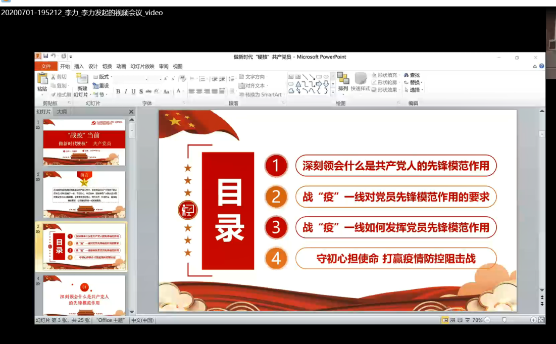 陈君丽同志在党课中强调:想要真正做合格共产党员,发挥先锋模范作用,要做到四讲;讲政治、讲担当、讲奉献,讲纪律。战疫过程中,我们看到党对待人民的生命安全,没有半点懈怠,依靠过硬的作风打赢这场防疫战。初心易得,始终难守。抗疫一线的各地,党员队伍中涌现出无数挺身而出、舍我其谁的党员同志们,又再一次证明了党性的光辉和号召力。同时她也对比一些反面教材,让我们更加警醒,在大是大非面前必须时刻保持坚定的政治立场。