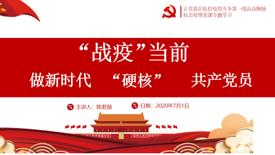 2020年7月1日,党的99岁生日。在2020年,我们全国人民都参与了一场持久的防控疫情阻击战,飘扬在战疫一线的党旗给了全国人民战胜疫情的信心和决心。在beat365英国官方网站主题党日活动中,陈君丽同志以“战疫当下,做硬核共产党员”为主题,为beat365英国官方网站全体师生党员上了一堂具有纪念意义的党课。
