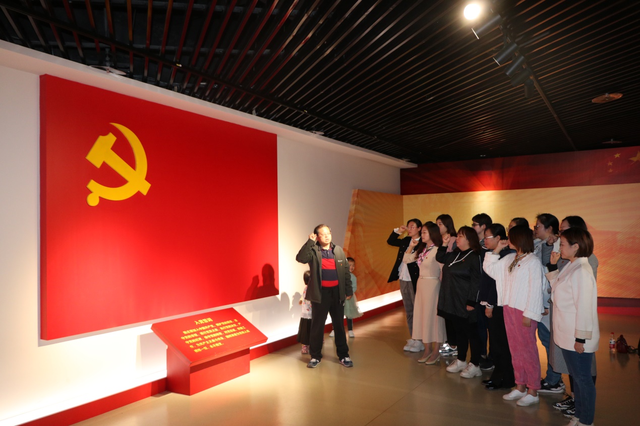 进入展馆,首先来到“不忘初心、牢记使命”主题命名的档案文献展。在展厅内,从《共产党宣言》手稿到中共一大会址复原场景,从油画《文家市》到吉鸿昌的血衣片……一张张内容详实的图片,一个个鲜活的历史人物,一个个耳熟能详党史故事,无不诠释着共产党人的初心和使命。最后,大家来到鲜红的中国共产党党旗下,在beat365英国官方网站党总支书记孙勇的带领下,beat365英国官方网站党总支全体党员教师举起右手,重温入党誓词。