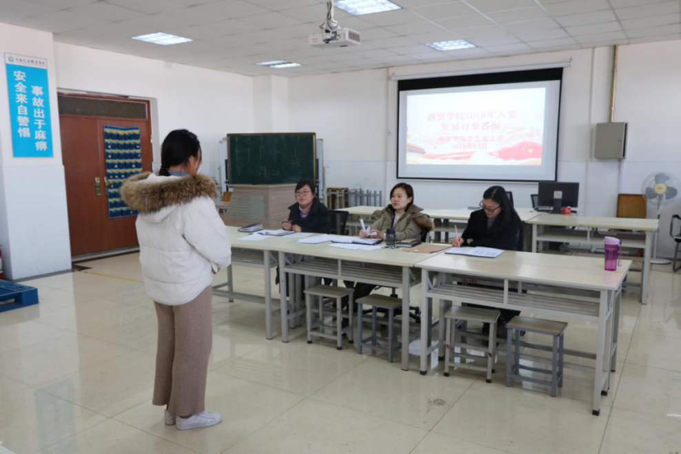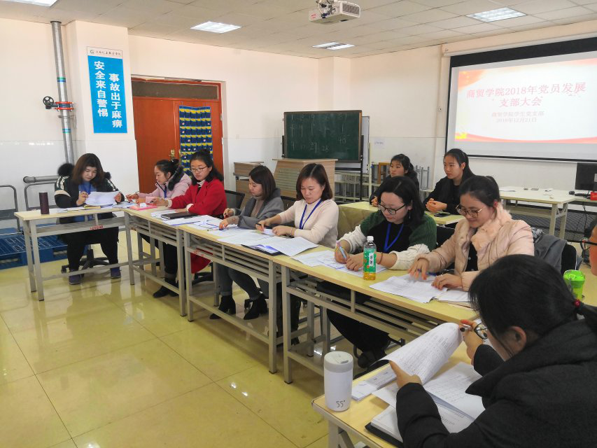 2018年12月21日,商贸学院党总支在实训楼615召开党员发展大会,周燕书记主持会议,学生支部的全体党员及培养教师参加。