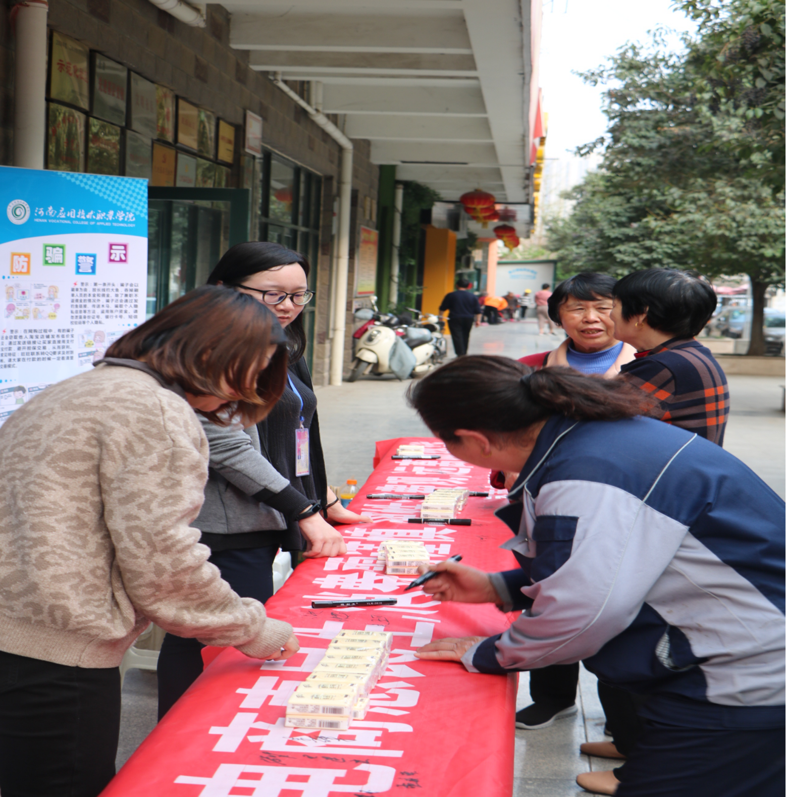 海报上醒目的“防骗”标题吸引了社区里来往的人们,很多居民驻足了解,有些指着海报问询,有些拿出手机询问,有些拍照记录,志愿者们对于提出的问题热心地解答。社区老年人对于这个主题尤为关注,纷纷说这个主题很好,有些还帮助拉住年轻人共同了解防骗知识。有些小朋友也主动跟志愿者聊天,说要回家和家人进行分享。