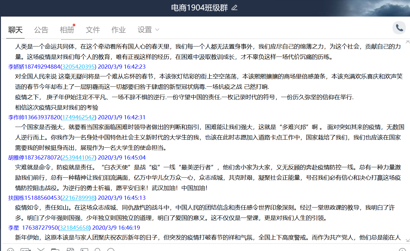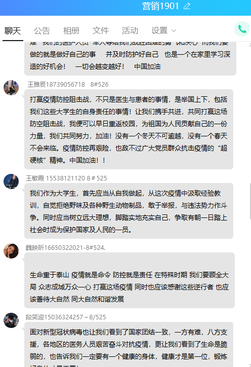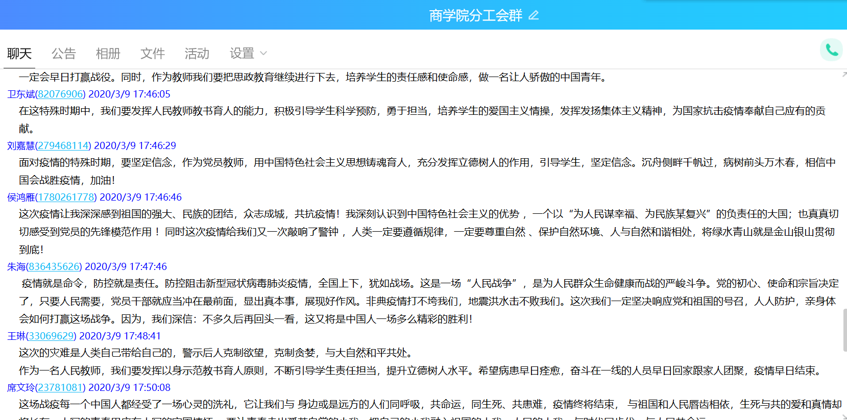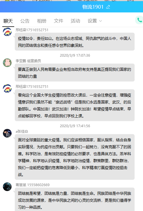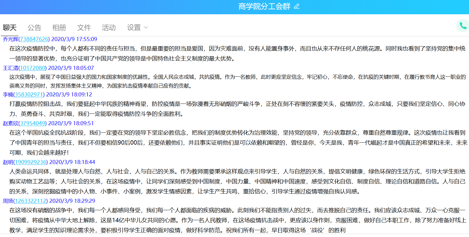 本次“同上一堂疫情防控思政大课”beat365英国官方网站共有28名教师,1531名学生参与观看,其中教师28人均参与了讨论发言,beat365英国官方网站共计41个班级在QQ群、微信群、在线课堂等途径开展了讨论和发言。