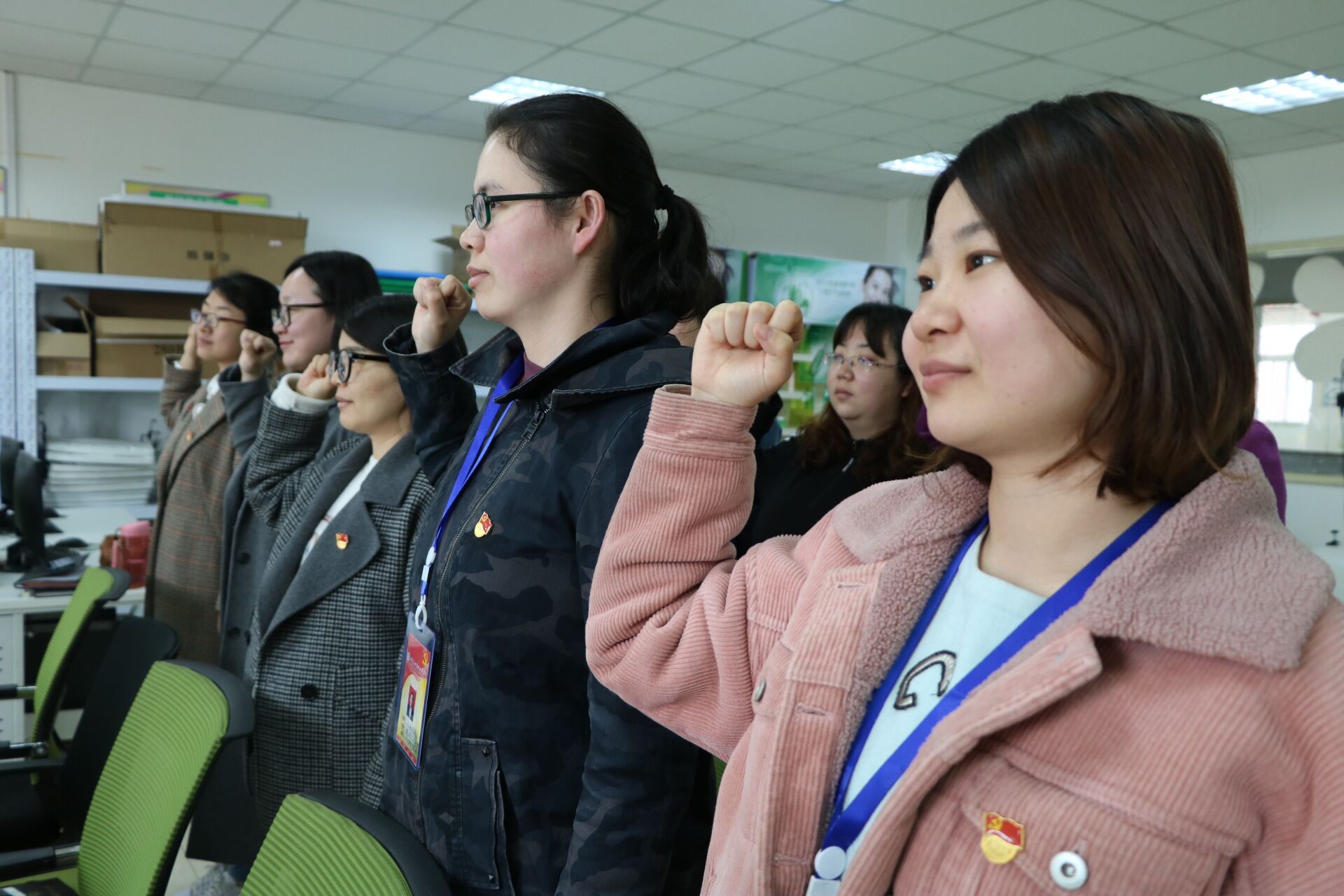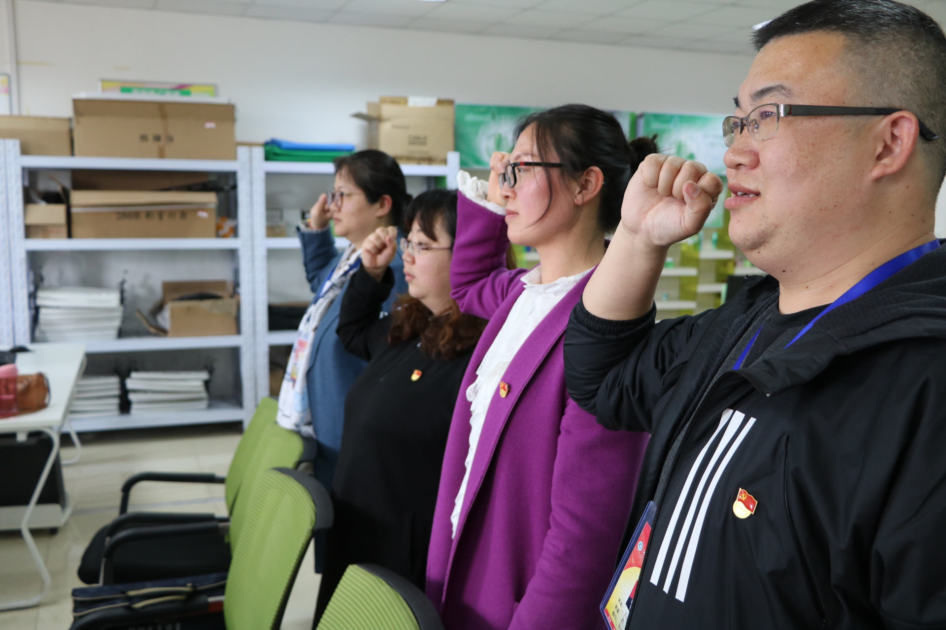 随后,全体党员在孙勇院长的带领下学习了《关于党徽佩戴和管理工作的通知》,并举行了庄严的党员徽章佩戴仪式。孙勇院长和周燕书记为每位党员佩戴党员徽章,带领大家重温入党誓词。当鲜红的党员徽章佩戴在同志们的胸前时,党员的身份被亮明,党员光辉形象自然呈现,自豪感和使命感油然而生。
