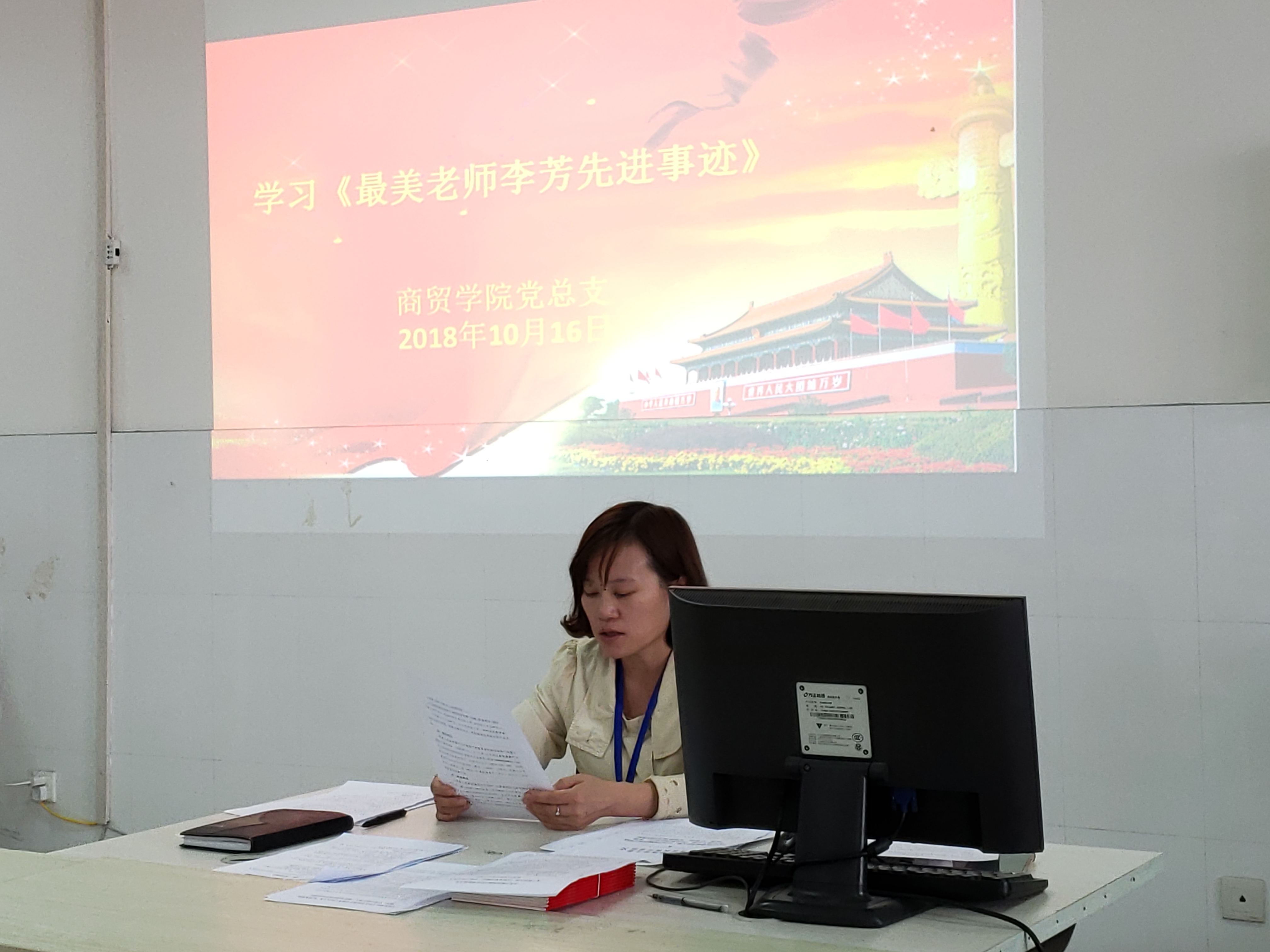 “当死神呼啸而来,她用尽生命之力为孩子们竖起安全壁垒,瞬间彰显高尚师德,平凡中铸就伟大人生……“善行无疆、恪尽职守……”。10月16日下午,商贸学院党总支组织召开全国优秀共产党员、全国优秀教师里李芳老师的先进事迹学习会。学习会由党总支书记周燕老师主持,商贸学院全体教职工参加。全体老师共同学习了2018年8月9日人民日报发表的关于李芳老师事迹的文章《引路,永恒的星光》。在学习过程中,偌大的教室内鸦雀无声,在场的很多老师们都红着眼睛,有的默默的擦着眼泪,有的已经泣不成声,领学教师几度失声哽咽。会场的每一位同志都被最美教师李芳老师的先进事迹感动着。