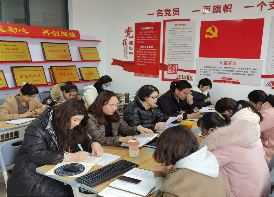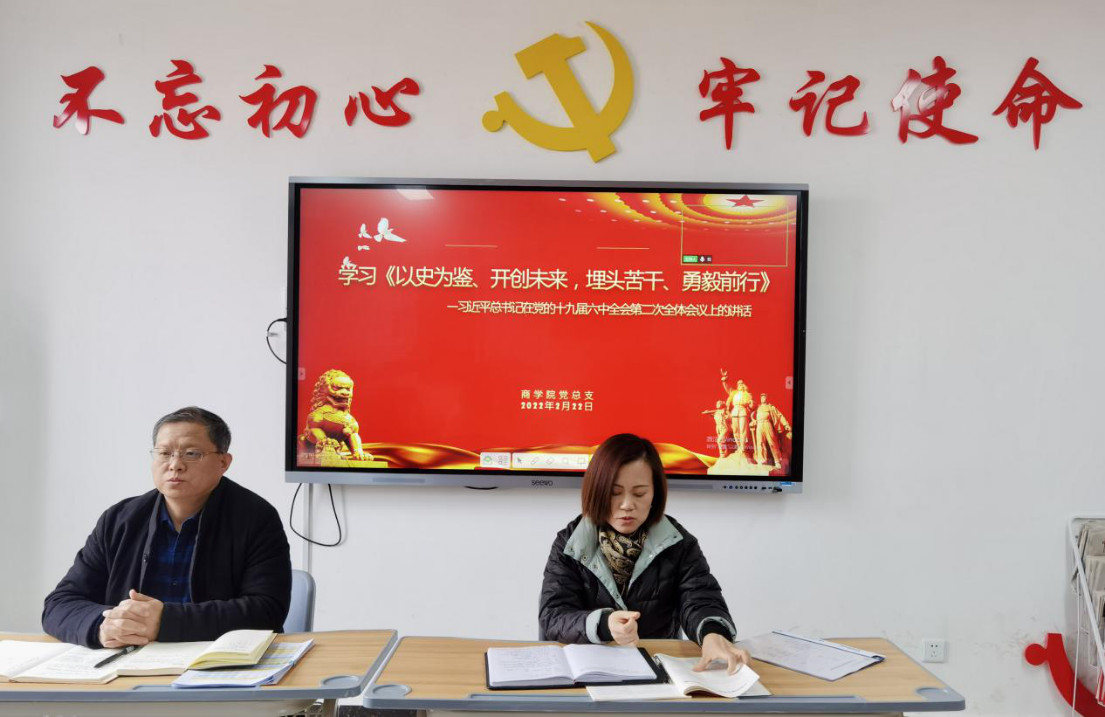 会上,办公室主任刘嘉慧领学了习近平总书记在党的十九届六中全会第二次全体会议上的讲话《以史为鉴、开创未来、埋头苦干、勇毅前行》,团总支书记李力、教学办主任王珂、学工办公室主任刘超领学了2022年全省教育工作会议中的十项重点工作。