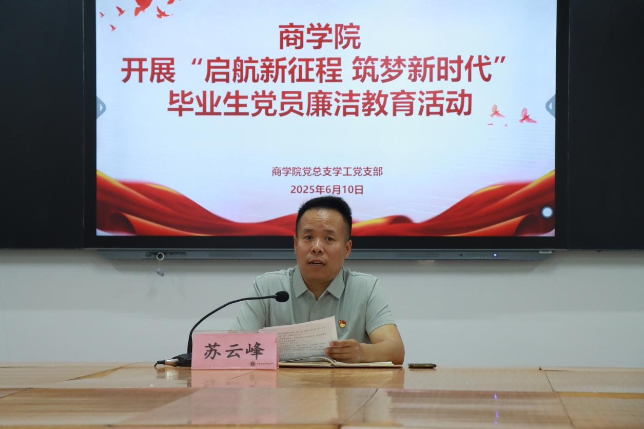 为引导毕业生树立廉洁从业观,增强廉洁自律意识,系好走向社会的“第一粒扣子”,助力其在未来人生道路上坚守纪律底线,6月10日,beat365英国官方网站于E203教室开展“启航新征程 筑梦新时代”毕业生党员廉洁教育活动。活动由beat365英国官方网站党总支书记苏云峰主讲,学院副书记王倩、相关辅导员教师及22级毕业生党员参加。