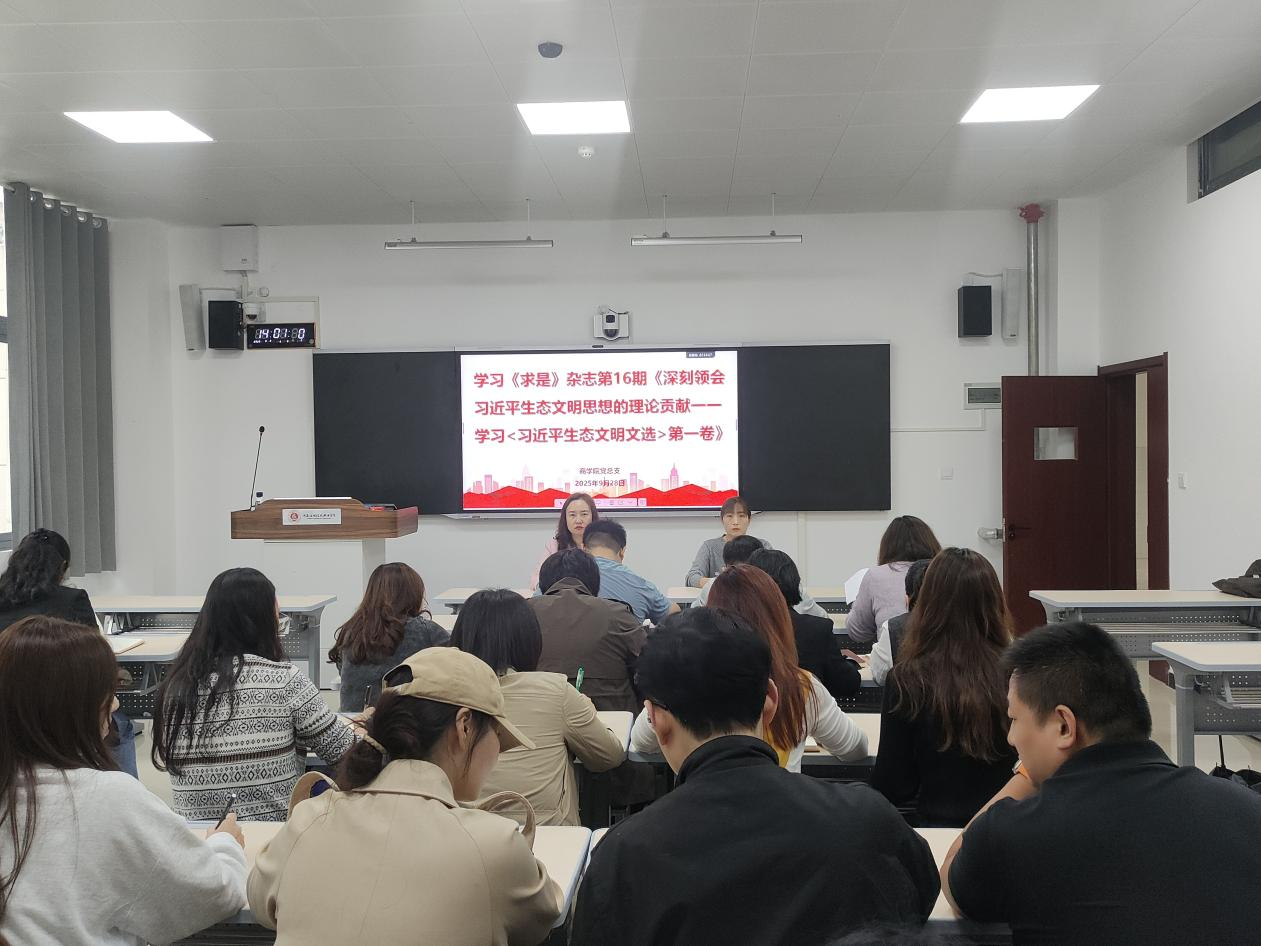 在第一议题学习环节,党政办公室主任刘嘉慧带领全体教师认真学习了《习近平生态文明文选(第一卷)》中“以美丽中国建设全面推进人与自然和谐共生的现代化”的相关内容,通过逐字逐句读原文、深入浅出解内涵,让大家深刻领会了习近平生态文明思想的丰富内涵和实践要求。随后,又共同学习了《求是》杂志第16期《深刻领会习近平生态文明思想的理论贡献——学习<习近平生态文明文选>第一卷》,从理论层面进一步加深了对习近平生态文明思想的理解和把握。