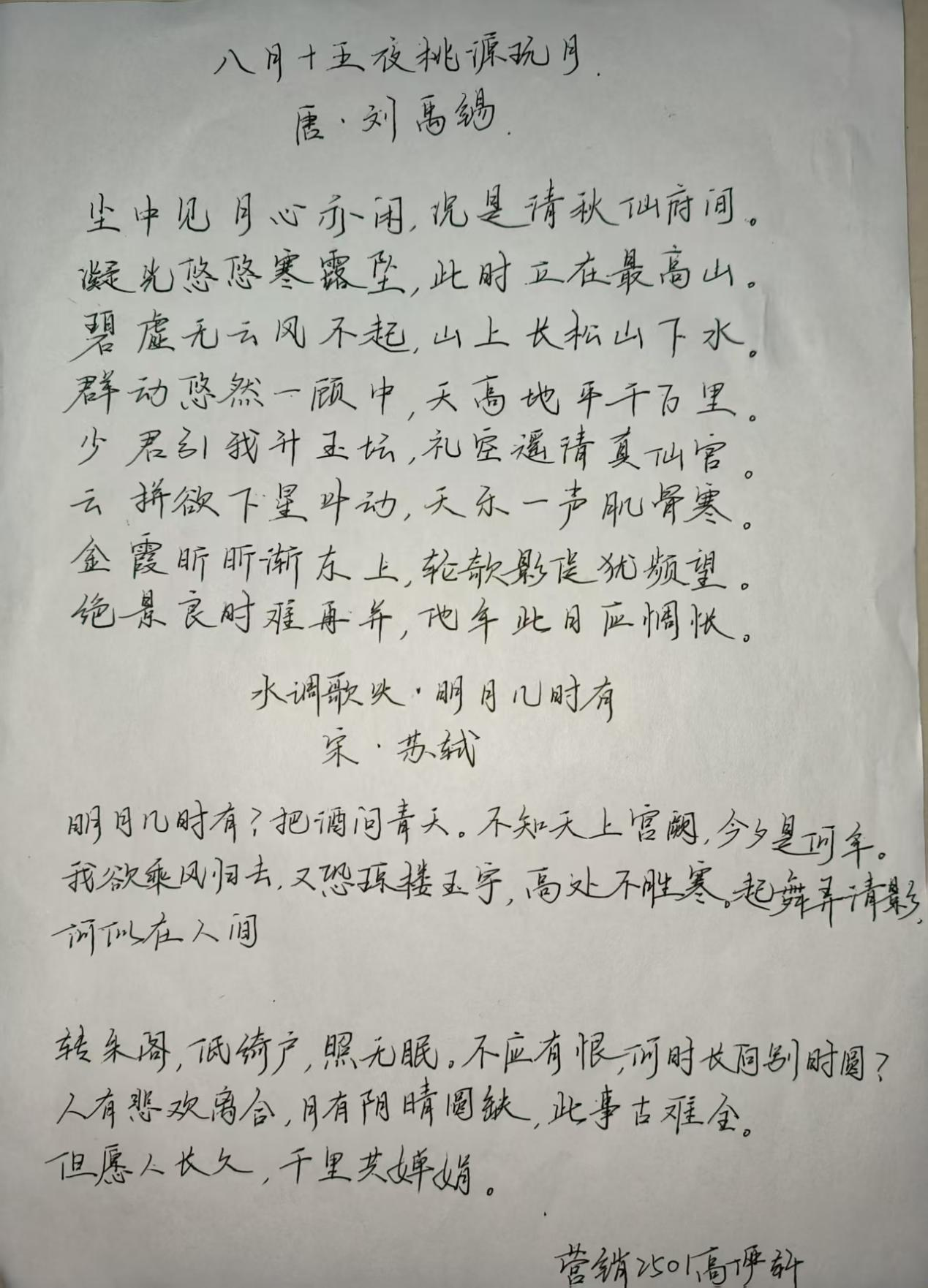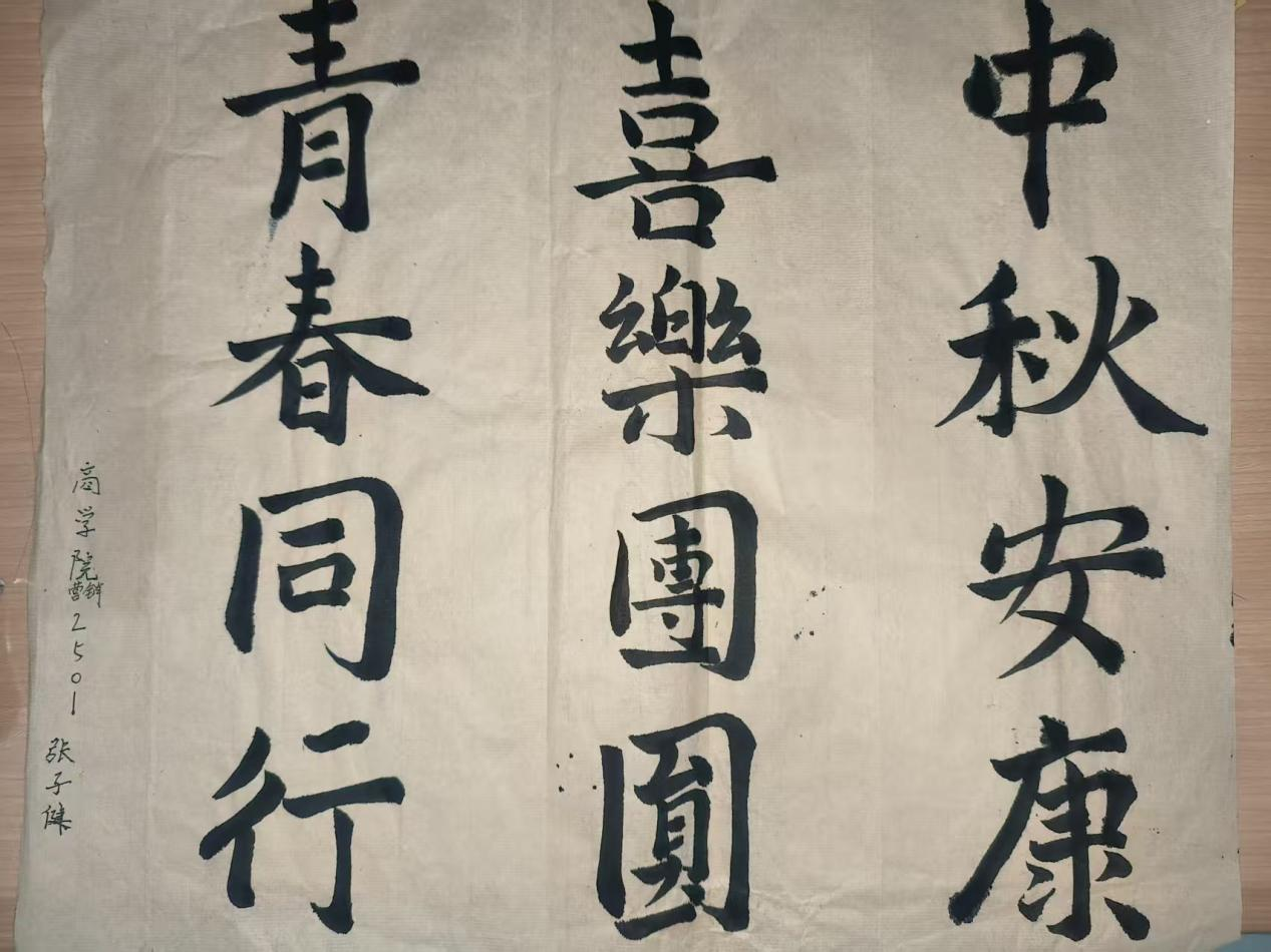 活动现场,学子们以笔为媒,将中秋元素与青春感悟融入创作。手抄报比赛中,同学们围绕“中秋传说”“家国情怀”主题展开构思,以细腻笔触勾勒嫦娥奔月、玉兔捣药的经典场景;书法比赛现场则墨香四溢,软笔组学子挥毫泼墨,“中秋安康”“喜乐团圆”等词句在宣纸间流淌,硬笔组作品则以工整笔触展现青年的严谨与朝气,一幅幅作品既饱含对传统节日的敬意,更传递出新时代青年的精神风貌。