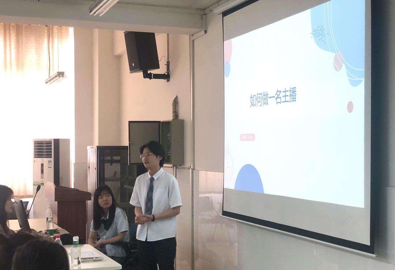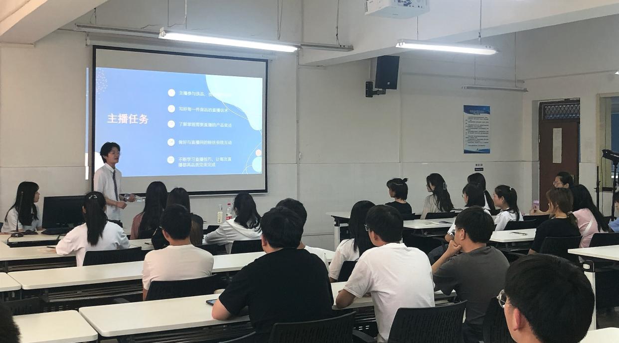 为满足企业对直播人才的需求,提供精准人才服务,多形式、多渠道探索电商主播人才培训模式,提升主播销售专业素养,壮大电商直播人才队伍,beat365英国官方网站电商工作室于5月27日下午在E602开展了电商直播培训。本次活动邀请了来自海一云商的优秀老师,他给同学们进行了一场“如何成为一位优秀主播”的主题培训,beat365英国官方网站网络营销、电子商务等专业的同学参加了培训。