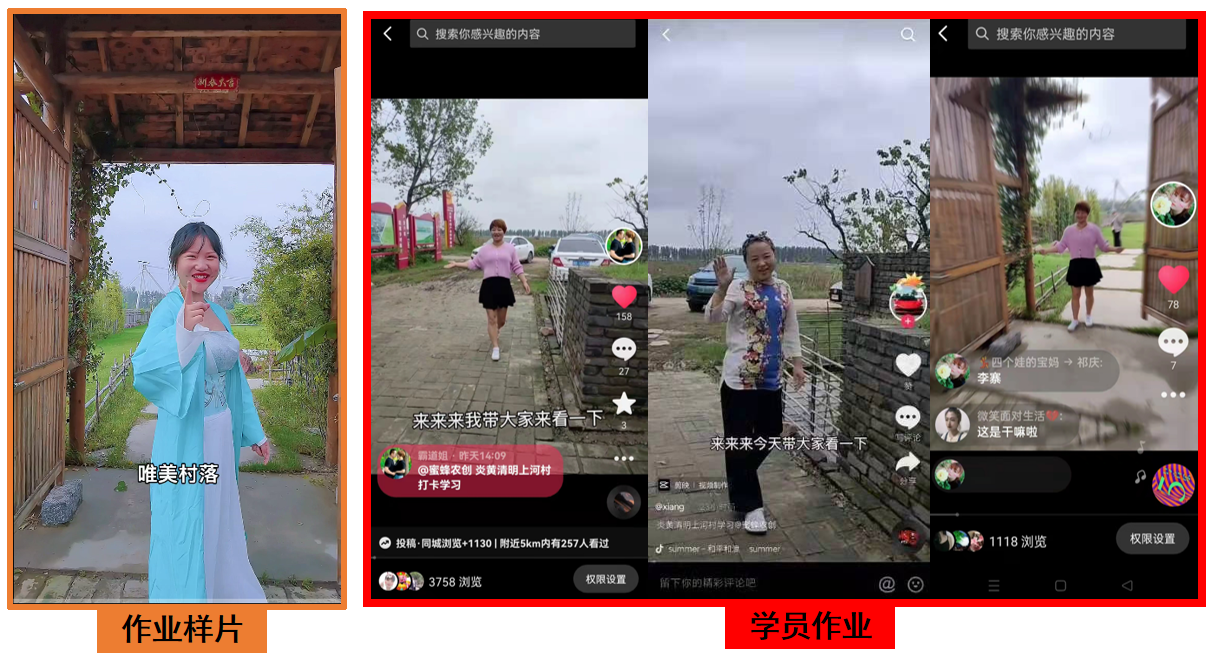 “来来来,接下来带你看一个隐藏在黄河岸边的唯美村落……”电商技术服务队的老师正在教村民如何拍摄和剪辑一条旅游打卡视频,拍摄的地点正是此次培训的场地——坐落于杜良乡的炎黄清明上河村。村民们在老师的指导下,一个个变身网红主播和摄影师,分组完成打卡视频的拍摄剪辑、编辑文案、上传作品,在抖音平台提交了这次“不太一样”的培训作业。