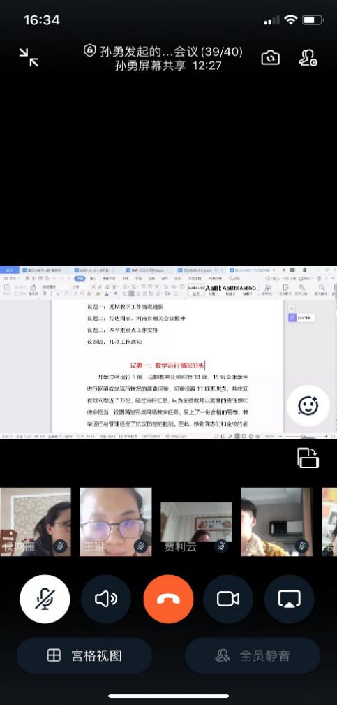 会上,孙勇院长就疫情防控期间网上教学运行情况,从好的一面和存在的问题两方面进行了总结,要求各任课教师要立足教学,切实做好网上授课工作,确保在线教学与课堂教学的效果实质等效。接着,孙院长又传达了国家、河南省相关会议精神,统筹抓好疫情防控和各项工作正常开展。