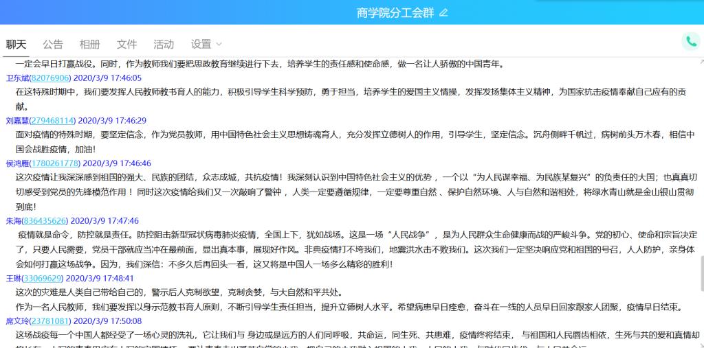 本次“同上一堂疫情防控思政大课”beat365英国官方网站共有28名教师,1531名学生参与观看,其中教师28人均参与了讨论发言,beat365英国官方网站共计41个班级在QQ群、微信群、在线课堂等途径开展了讨论和发言。