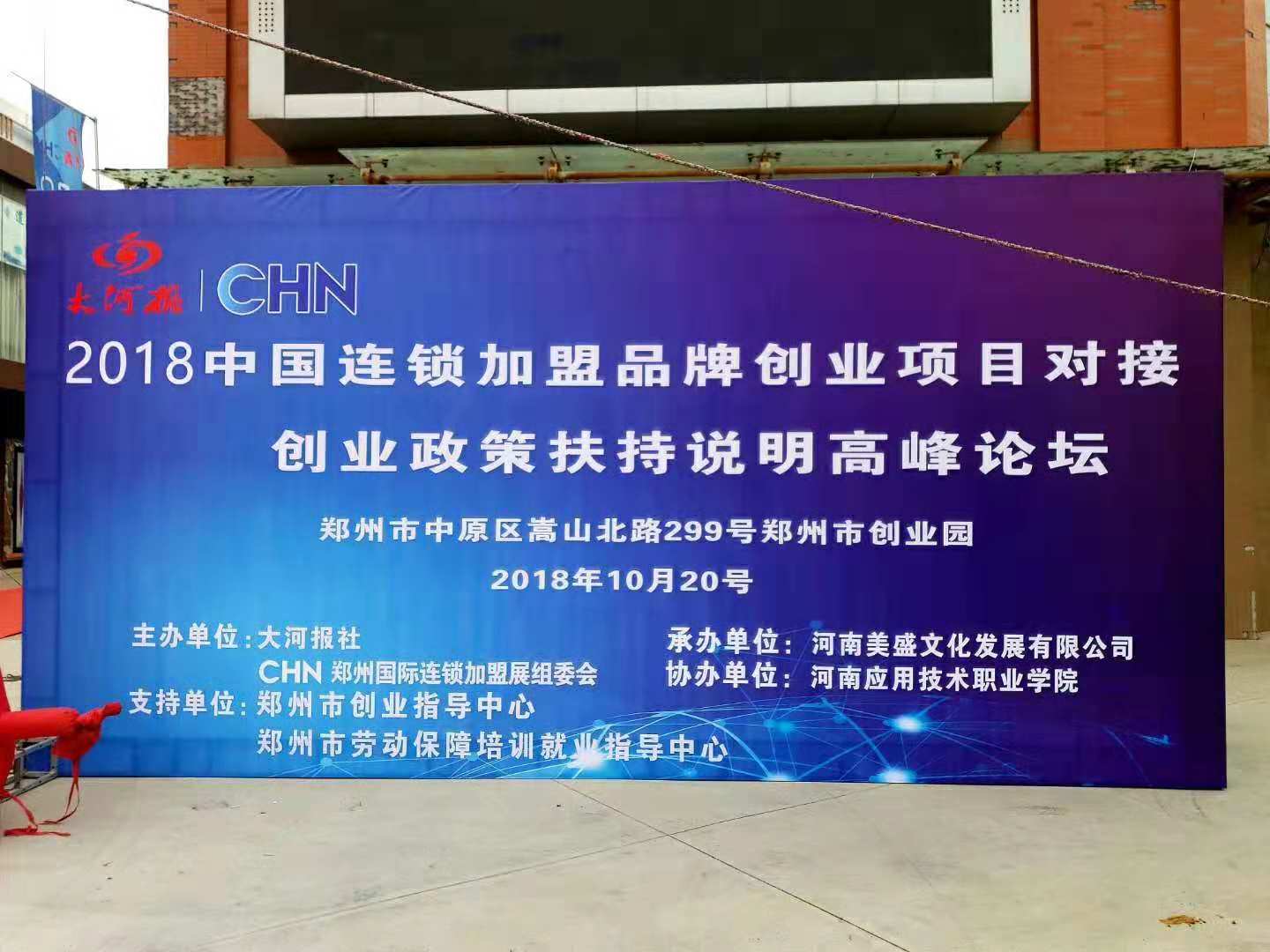 10月20日,由河南日报报业集团大河报社,郑州市人社局创业指导中心,CHN郑州国际连锁加盟博览会联合主办,河南美盛文化发展有限公司承办,beat365英国官方网站商贸学院协办的“2018中国连锁加盟创业项目对接及创业扶持政策说明高峰论坛”,在郑州市创业园区隆重举办。