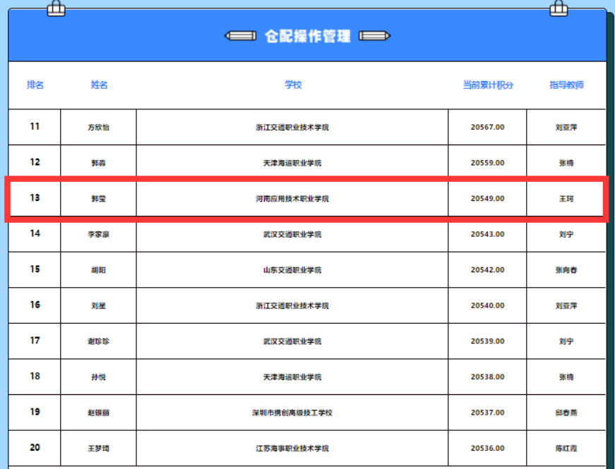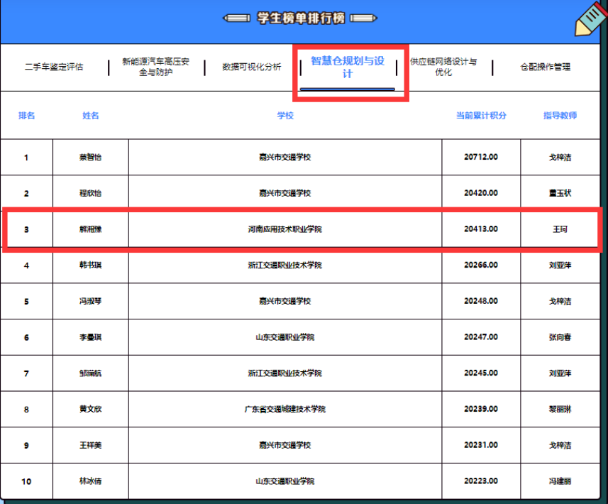其中,2021级物流管理专业学生解湘豫在智慧仓规划与设计赛项(该赛项共报名8048人)中,以全国排名第3的优异成绩,获得该赛项一等奖;2020级物流管理专业学生郭莹在仓配操作管理岗赛项(该赛项共报名15177人)中,以全国排名第13的优异成绩,获得该赛项一等奖。