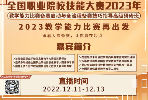 该培训主要包含了“教学能力比赛的规则变更与备赛启动”、“教学比赛的教学设计与课堂实录”和“职业院校教师教学能力竞赛如何对标备赛”三个模块。