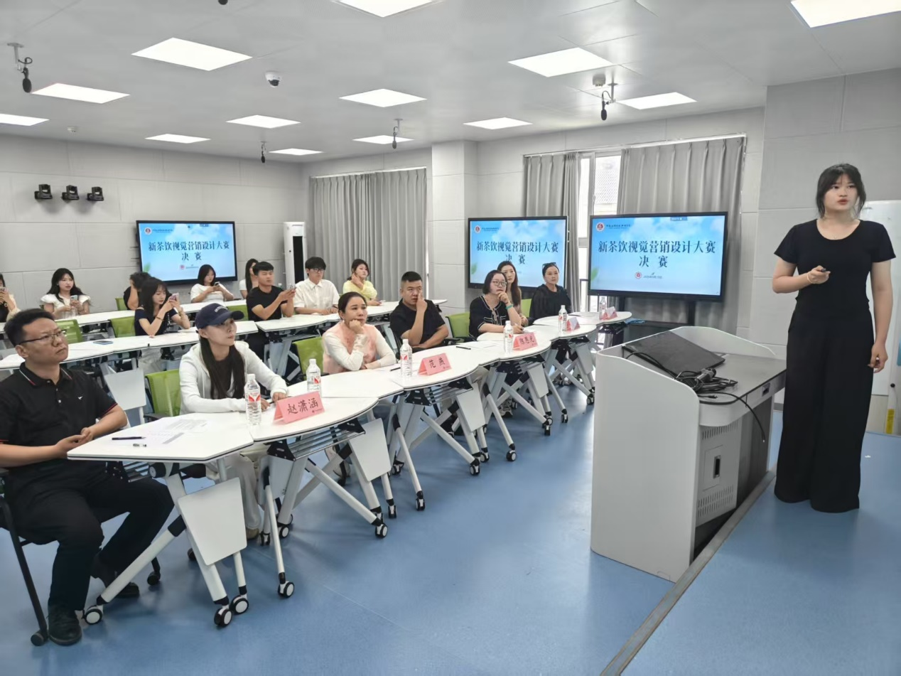 经过教师团队的严格评审,10支团队晋级决赛。决赛现场邀请王大昌品牌总经理陈恩光先生、非遗“宋代七汤点茶”传承人范燕大师、电商与网营教研室教师担任评委,秉持“设计完整性、创意表现、现场讲解”三维评分标准,确保评判专业、公正、权威。在激烈比拼中,选手们以鲜明的创意语言,展示了对非遗品牌视觉再造的深度思考与独立设计能力:或传承传统美学,或融合流行元素,呈现出既有文化厚度又具电商传播力的作品。最终,“茶不思 饭不想”、“茗日边缘”、“有请下一组”三个工作室凭借内容完整、风格新颖、讲解精彩的综合表现荣获一等奖,“叮咯咙咚昌”等五个工作室获得二等奖,“茶里茶气”等七个工作室获得三等奖。