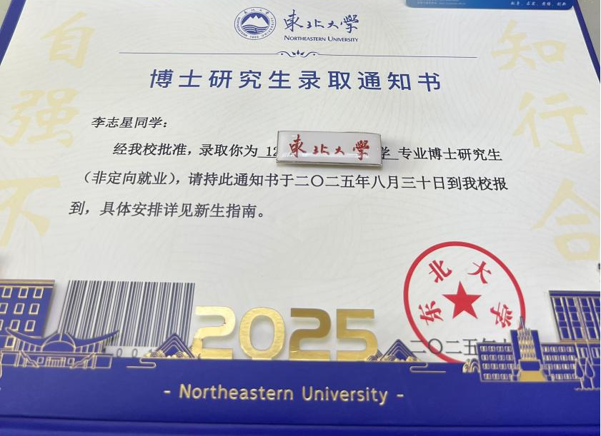 2025年7月17日,beat365英国官方网站物流1702班毕业生李志星收到东北大学博士研究生录取通知书,以十二年持续奋进的求学经历,在高等教育的进阶之路上留下了坚实足迹。