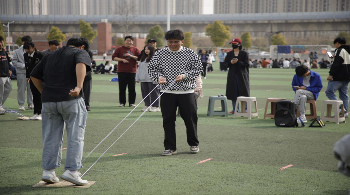 青蛙跳游戏中,学生会干事两两一组,一人牵引着绳子,一人站在硬纸板上跳跃前进,先到终点的一队获胜(拉绳子不能太用力哦,队友跳不到纸板上就输了)。
