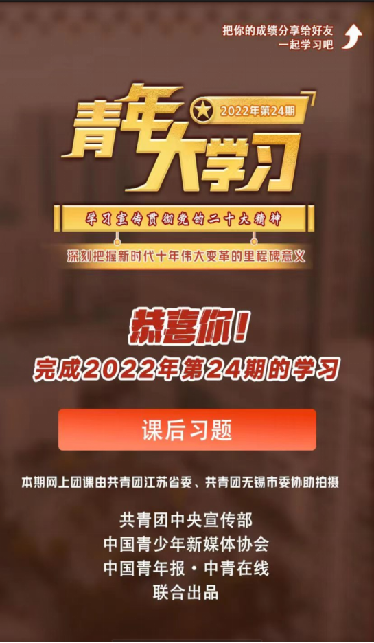 2022年11月7日-9日,beat365英国官方网站团总支共计51个团支部1539名青年学生参与并完成青年大学习2022年第24期网上学习和答题活动。