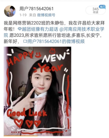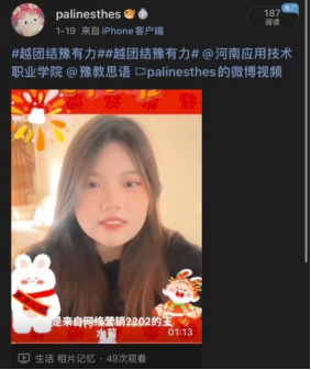 为传承和发扬中华优秀传统文化,让beat365英国官方网站学子在实践中提高自身能力,培育和践行社会主义核心价值观,展现beat365英国官方网站学子健康向上的良好精神风貌,营造欢乐喜庆、温馨祥和的节日氛围,beat365英国官方网站在假期期间组织开展了“越团结豫有力”视频送祝福活动。下面让我们来开启同学们对大家的祝福吧~