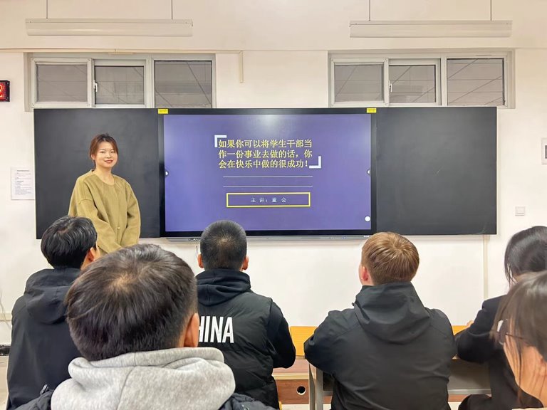 董会以《学生干部应如何处理学习与工作的关系》为主题,从学生干部的多重身份、学生干部需具备的基本素养、学生干部工作的特点和地位等几方面进行讲解。并在课程最后对学生会干部提出殷切期望。期望在未来工作中,学生干部能够以严谨认真的态度履行学生会职责,并在学生日常服务和班风学风建设中发挥模范带头作用,期望学生干部增强使命感,认真履行职责,提升工作能力,保持积极的工作态度,加强交流学习,勇于实践锻炼,成为一名合格的学生干部。