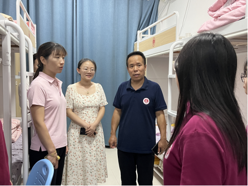 新学期开学之际,为了解beat365英国官方网站2023级学生搬迁至开封校区后开学阶段的思想状态和对新校区的适应情况以及了解2024级新生的生活状况及住宿情况。9月8日晚,学院党总支书记苏云峰、副书记王倩及学院辅导员教师深入学生宿舍,看望慰问学生,并与同学们进行了亲切交流。