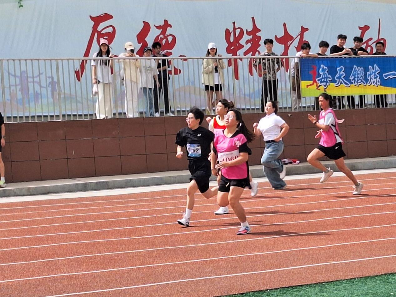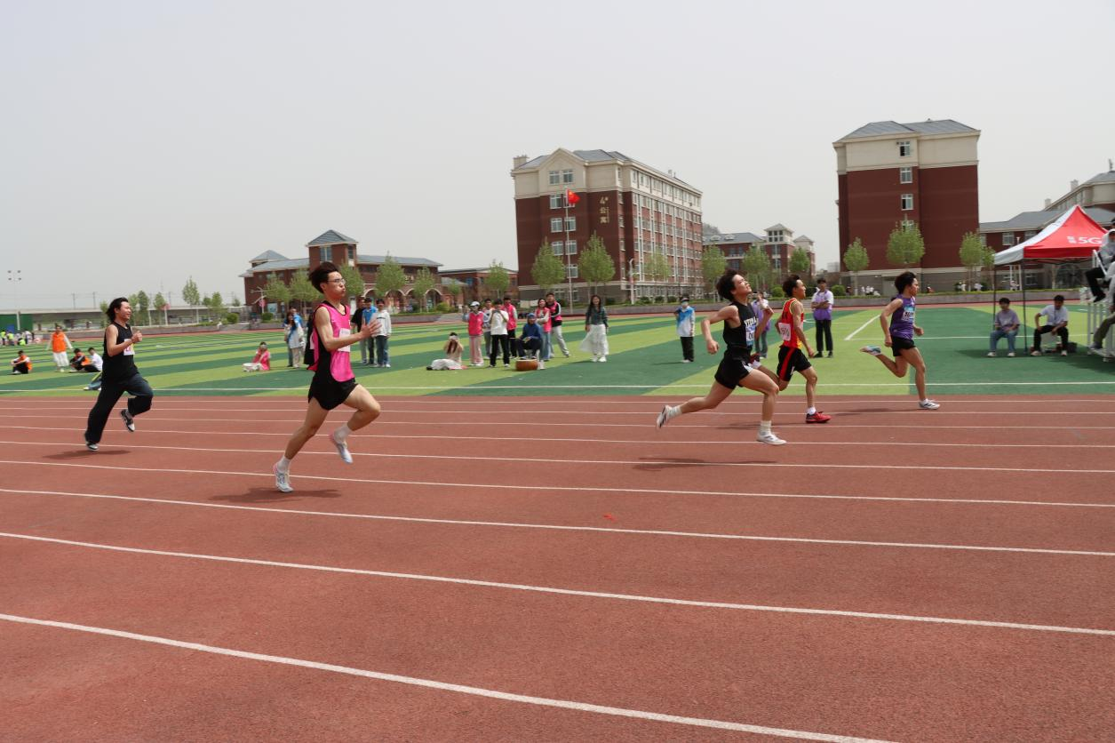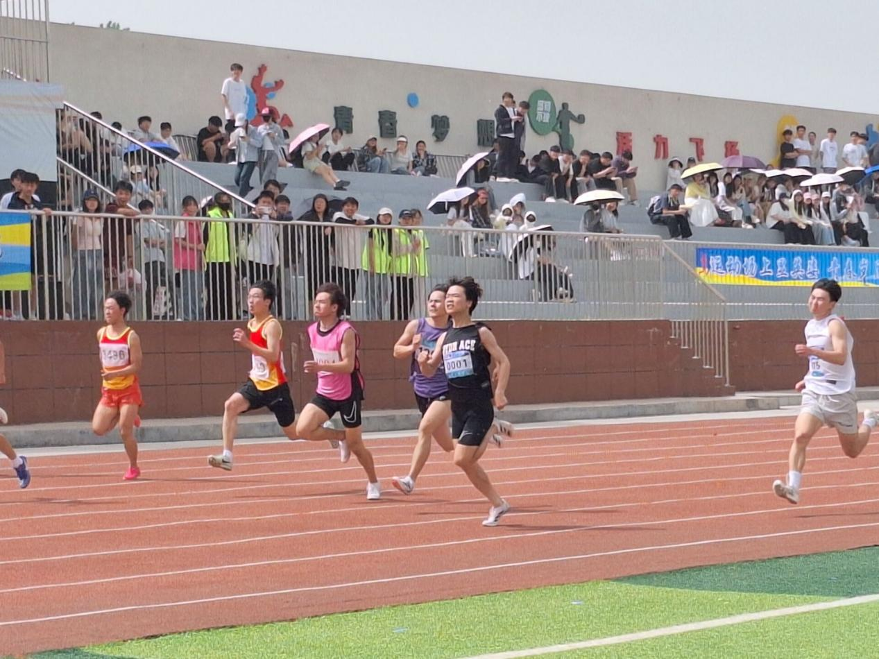 男子100米赛场上,选手们俯身蹲踞,严阵以待。随着发令枪响,他们如箭般飞驰,步伐疾如闪电。营销2401班贾晨冉取得第五名的好成绩。